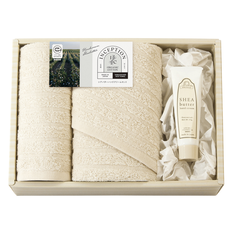 | 内容 | フェイスタオル(約32×75cm)、ハンドタオル(約32×30cm)、シアバターハンドクリーム(30g) |