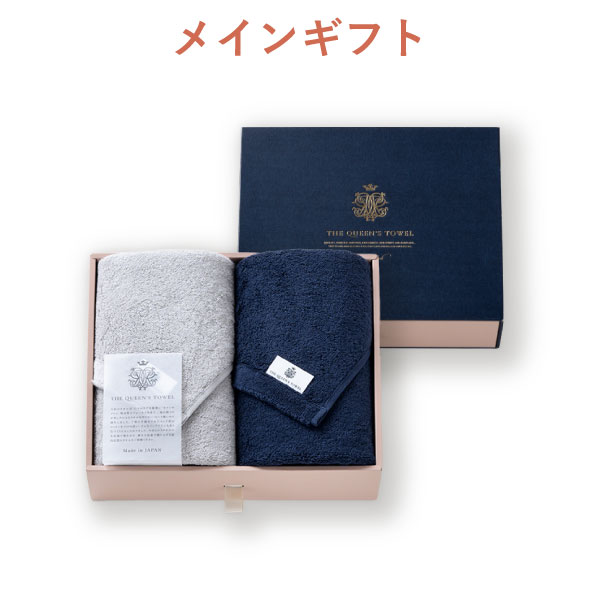 『THE QUEEN'S TOWEL』は、素材から色・パッケージまで一切妥協なくこだわり抜き、“上質”と“心地よさ”を追求した大人のためのプレミアムタオルです。「日々使うものだからこそ、触れたときの幸福感や満足感を楽しめるようなタオルを作りたい」そんな想いから生まれた『THE QUEEN'S TOWEL』。王妃のタオルとも呼ばれるそのタオルは、思わず顔をうずめたくなるようなやわらかい肌触り。日常の中で何気なく触れた瞬間ほっと安らぐような幸せと充実感を届けてくれます。タオルの名産地、今治で生まれたタオルならではの高い吸水性を持ち、その実力はドライヤーの時間を短縮させるほど。 ネイビーとグレーのシンプルで美しいデザインのフェイスタオルのセットは、どなたにも喜んでいただけます。手に届いた瞬間、あなたの大切な方を想う気持ちが伝わる至高のタオル。目上の方への贈り物にもふさわしい、箔を入れた高級感溢れるパッケージとなっています。