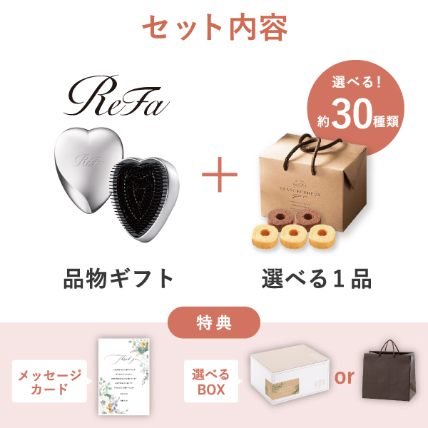 品物ギフトは、大人気の「ReFa HEART BRUSH」。食品ギフトをセットにした、お祝いや内祝い・お祝い返しに人気のギフトセットです。