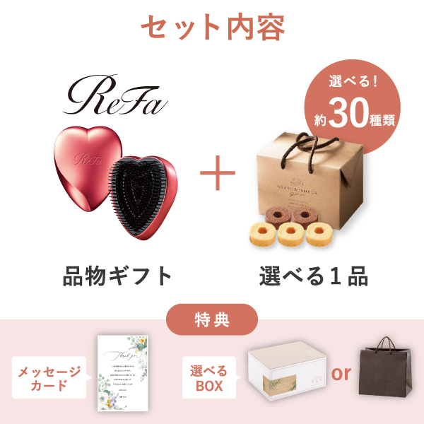 品物ギフトは、大人気の「ReFa HEART BRUSH」。食品ギフトをセットにした、お祝いや内祝い・お祝い返しに人気のギフトセットです。
