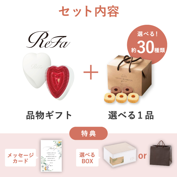品物ギフトは、大人気の「ReFa HEART BRUSH」。食品ギフトをセットにした、お祝いや内祝い・お祝い返しに人気のギフトセットです。