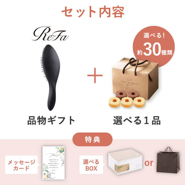 品物ギフトは、大人気の「ReFa AILE BRUSH」。食品ギフトをセットにした、お祝いや内祝い・お祝い返しに人気のギフトセットです。