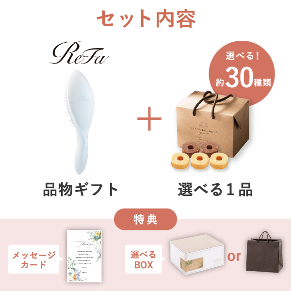 品物ギフトは、大人気の「ReFa AILE BRUSH」。食品ギフトをセットにした、お祝いや内祝い・お祝い返しに人気のギフトセットです。
