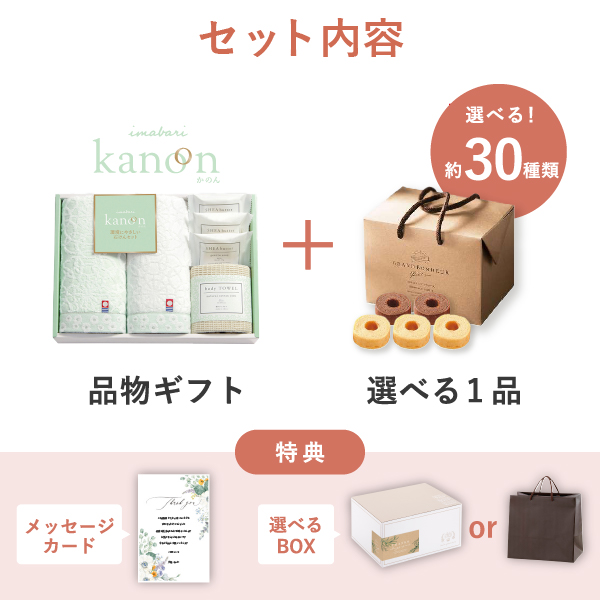 品物ギフト「今治かのん」と食品ギフトをセットにした、お祝いや内祝い・お祝い返しに人気のギフトセットです。
