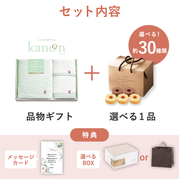 品物ギフト「今治かのん」と食品ギフトをセットにした、お祝いや内祝い・お祝い返しに人気のギフトセットです。