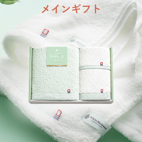 やわらかな糸が奏でるカスミソウと今治タオルのやさしいハーモニー。「感謝」という花言葉をもつカスミソウをモチーフに繊細なレース柄を織り上げた爽やかなグリーンとホワイトの今治タオルです。