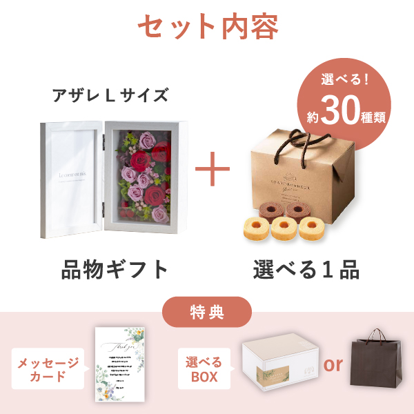 品物ギフトは、上品な可愛らしさが人気の「プリザーブドフラワー」です。プラス1品はお好みに合わせて選べる食品ギフトをセットにした、お祝いや内祝い・お祝い返しに人気のギフトセットです。