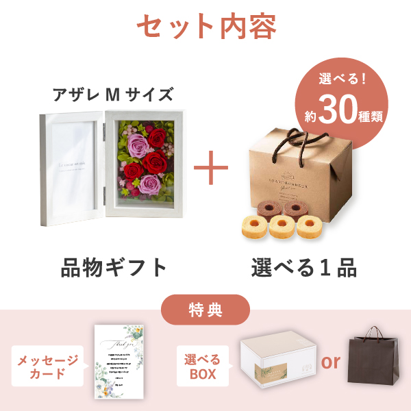 品物ギフトは、上品な可愛らしさが人気の「プリザーブドフラワー」です。プラス1品はお好みに合わせて選べる食品ギフトをセットにした、お祝いや内祝い・お祝い返しに人気のギフトセットです。
