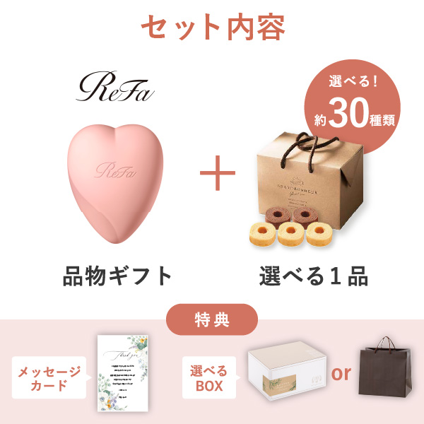 品物ギフトは、大人気の「ReFa HEART BRUSH」。食品ギフトをセットにした、お祝いや内祝い・お祝い返しに人気のギフトセットです。