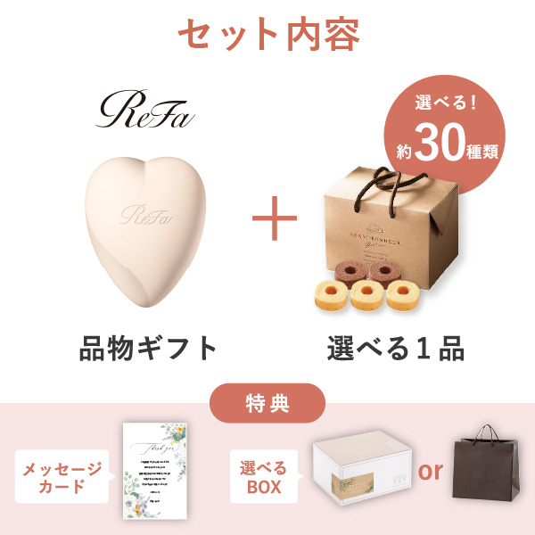 品物ギフトは、大人気の「ReFa HEART BRUSH」。食品ギフトをセットにした、お祝いや内祝い・お祝い返しに人気のギフトセットです。