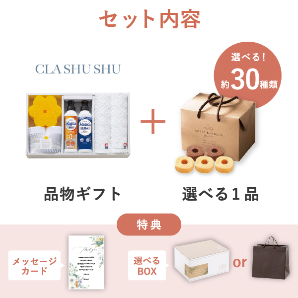 品物ギフト「クラシュシュ」と食品ギフトをセットにした、お祝いや内祝い・お祝い返しに人気のギフトセットです。