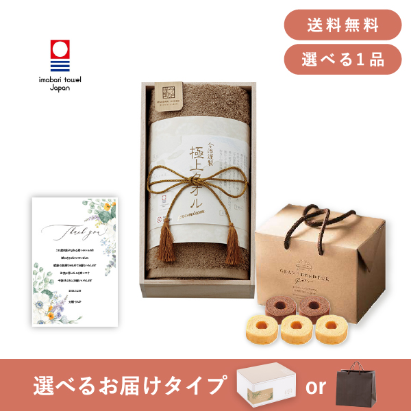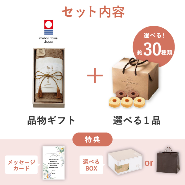 品物ギフト「今治謹製」と食品ギフトをセットにした、お祝いや内祝い・お祝い返しに人気のギフトセットです。