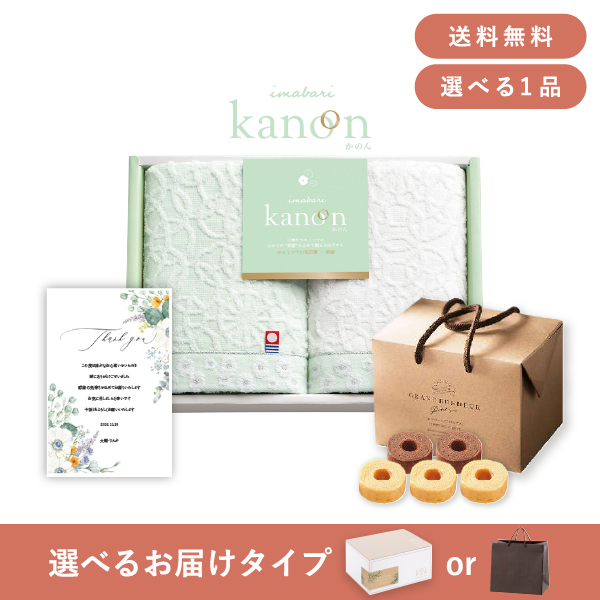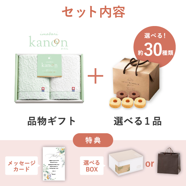 品物ギフト「今治かのん」と食品ギフトをセットにした、お祝いや内祝い・お祝い返しに人気のギフトセットです。