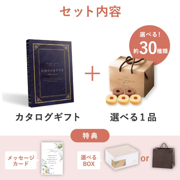 ピアリーオリジナルの人気が高いカタログギフト〔シュエット〕と、プラス1品に選べる食品ギフトをセットした、お祝いや内祝い・結婚や出産のお祝い返しにおすすめのギフトセットです。