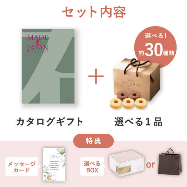 人気の高いカタログギフト〔MadeInJapan〕と、選べるプラス1品の食品ギフトをオリジナルセットにした、ピアリーオリジナルのギフトセット。