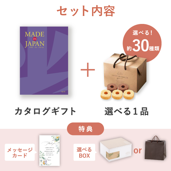 人気の高いカタログギフト〔MadeInJapan〕と、選べるプラス1品の食品ギフトをセットにした、おすすめのピアリーオリジナルギフトセット。