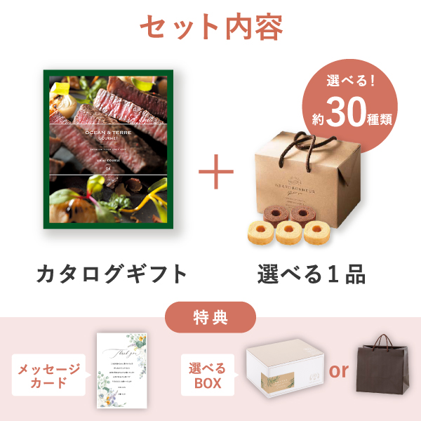 メインギフトは〔生産者の「思い」と「美味い」が伝わる産地直送〕にこだわった商品が選べる人気のカタログギフトと、選べるプラス1品の食品ギフトをセットにしたピアリーオリジナルギフトセットです。