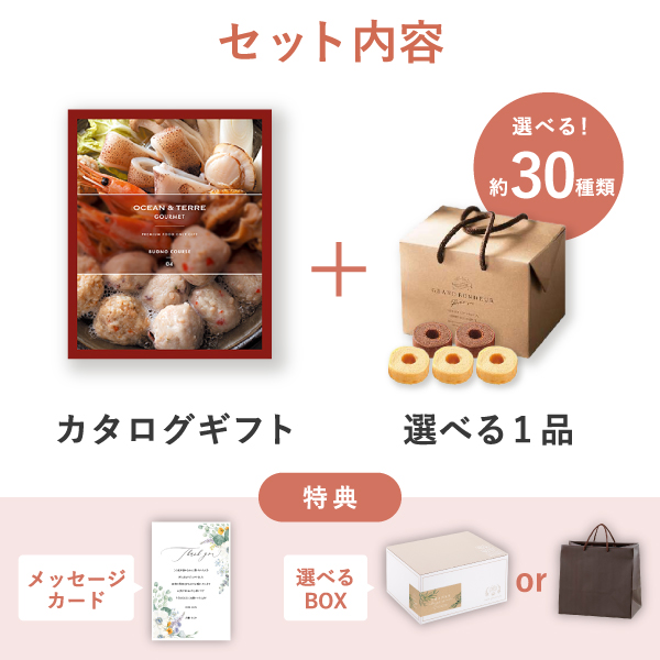 メインギフトは〔生産者の「思い」と「美味い」が伝わる産地直送〕にこだわった商品が選べる人気のカタログギフトと、選べるプラス1品の食品ギフトをセットにしたピアリーオリジナルギフトセットです。