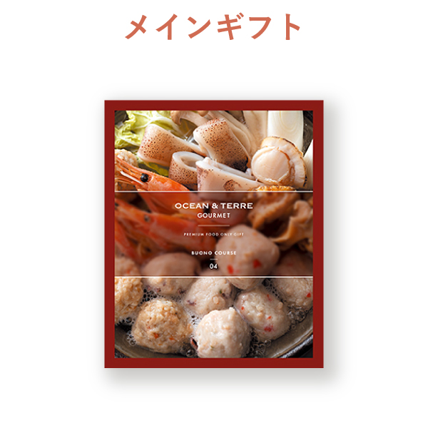 メインギフトのカタログギフトオーシャンテールグルメ【9000円コース】BUONO(ヴォーノ)は、お肉や点心セット、スイーツなど美味しいをぎゅっと詰め込んだカタログギフト。