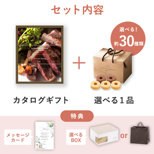 メインギフトは〔生産者の「思い」と「美味い」が伝わる産地直送〕にこだわった商品が選べる人気のカタログギフトと、選べるプラス1品の食品をセットにしたピアリーオリジナルギフトです。