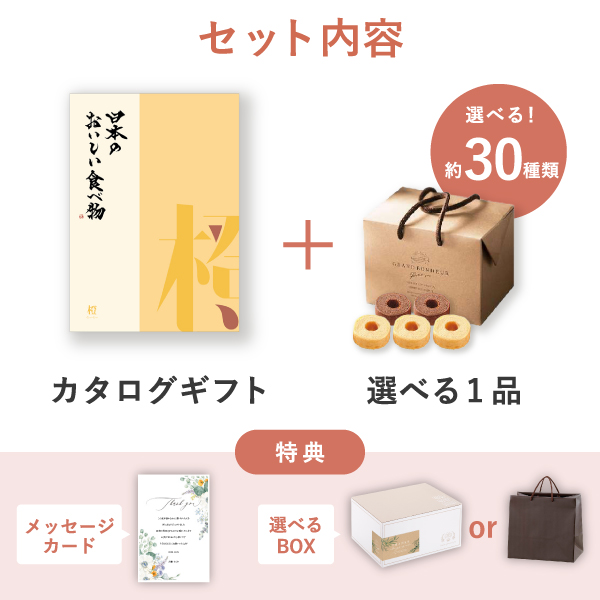 人気の高いグルメカタログギフトと選べる食品ギフトをプラス1品にセットした、ピアリーオリジナルのおすすめギフトセット。