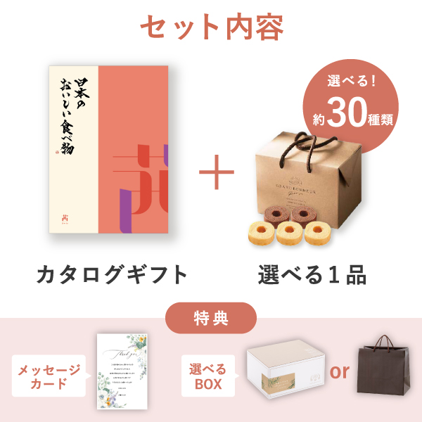 メインギフトは〔真面目な美味しさを伝えたい〕をモットーにする人気のカタログギフトと、選べるプラス1品の食品ギフトをセットにした、ピアリーオリジナルギフトセットです。