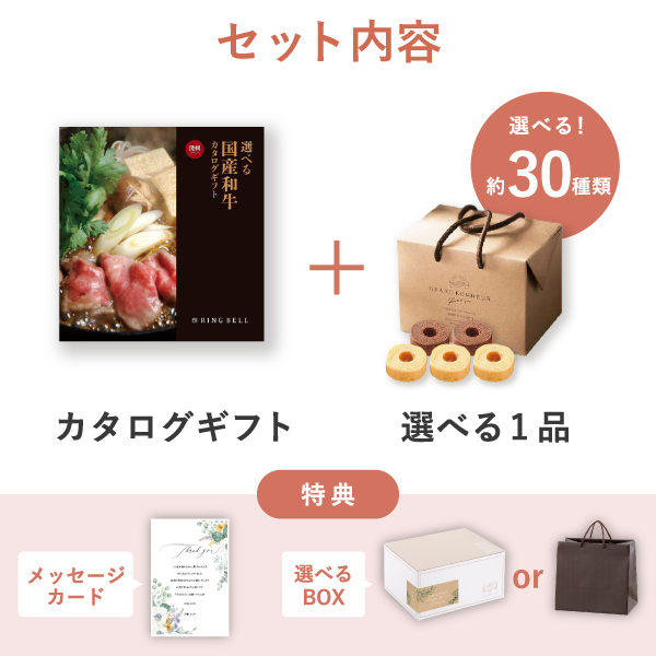 メインギフトは「大切な人に贈るからこそ上質なものを。」をモットーに誰もが大好きなお肉を選りすぐったカタログギフト「選べる国産和牛」と選べるプラス1品をセットにしたピアリーオリジナルのギフトセットです。