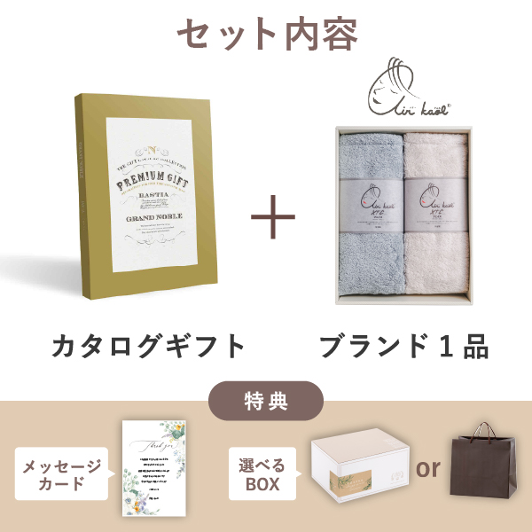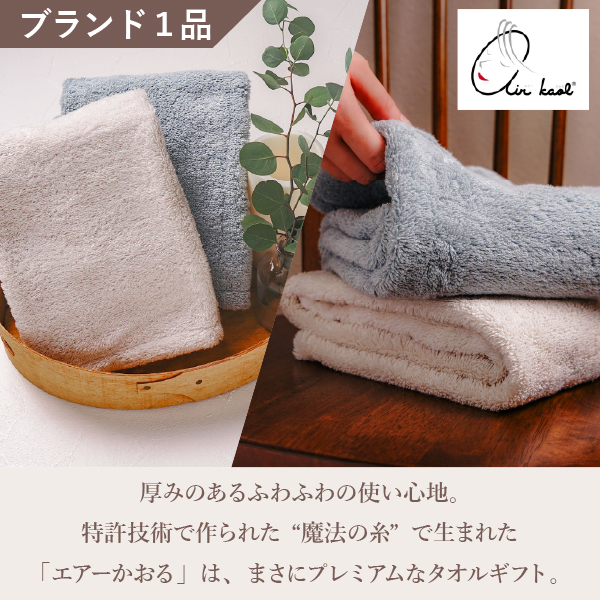 カタログギフトに人気の「エアーかおる」のタオルギフトをプラスした、ボリューム満点♪プレミアムなセットです。