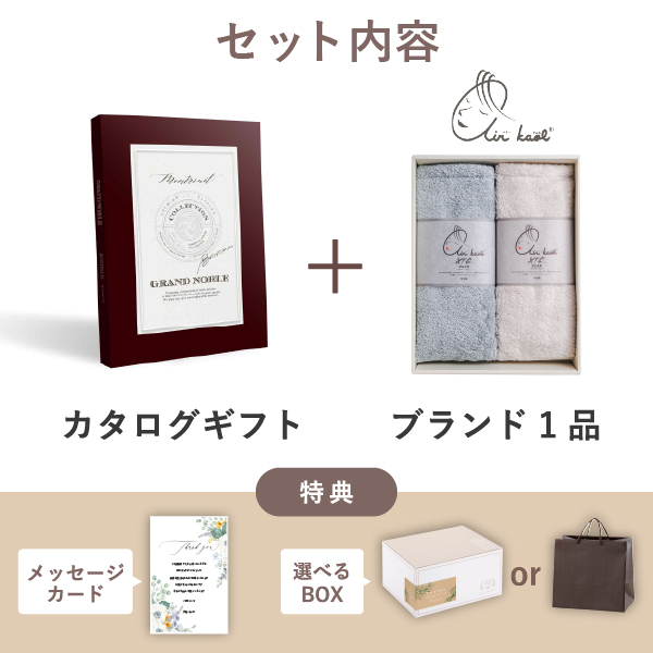 カタログギフトに人気の「エアーかおる」のタオルギフトをプラスした、ボリューム満点♪プレミアムなセットです。