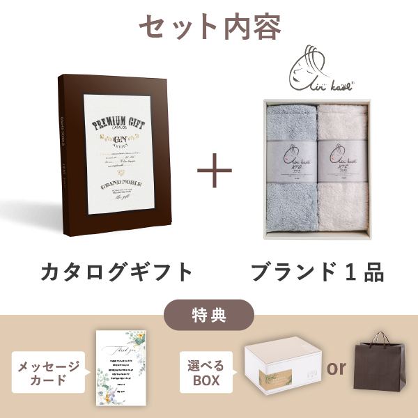 カタログギフトに人気の「エアーかおる」のタオルギフトをプラスした、ボリューム満点♪プレミアムなセットです。