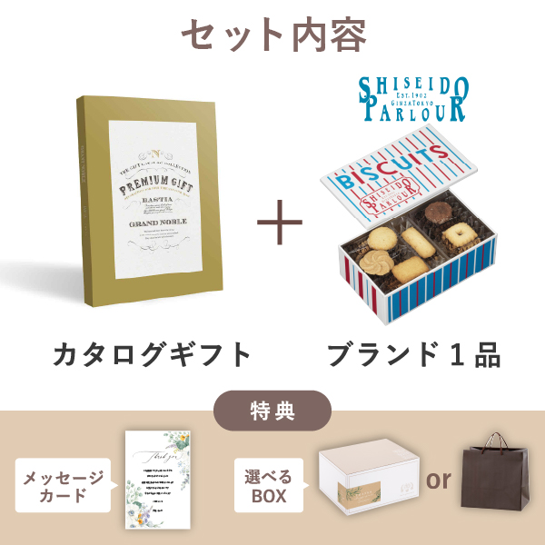 ブランド内祝いギフトセット(カタログギフト グランノーブル【4300円コース】バスティア+資生堂パーラー ビスキュイ 20枚入)|内祝い・お返しギフトならPIARY(ピアリー)
