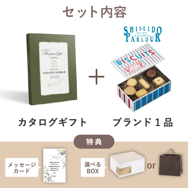 カタログギフトに人気の「資生堂パーラー ビスキュイ 20枚入」をプラスした、ボリューム満点♪プレミアムな内祝いのギフトセットです。