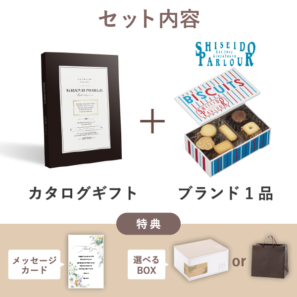 カタログギフトに人気の「資生堂パーラー ビスキュイ 20枚入」をプラスした、ボリューム満点♪プレミアムな内祝いのギフトセットです。