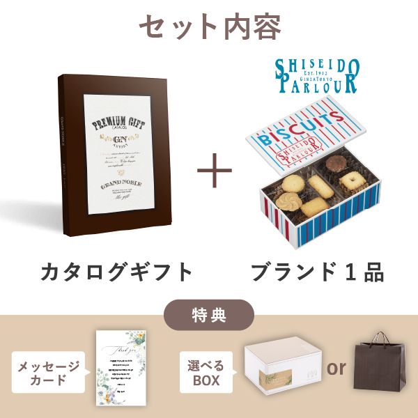 カタログギフトに人気の「資生堂パーラー ビスキュイ 20枚入」をプラスした、ボリューム満点♪プレミアムな内祝いのギフトセットです。