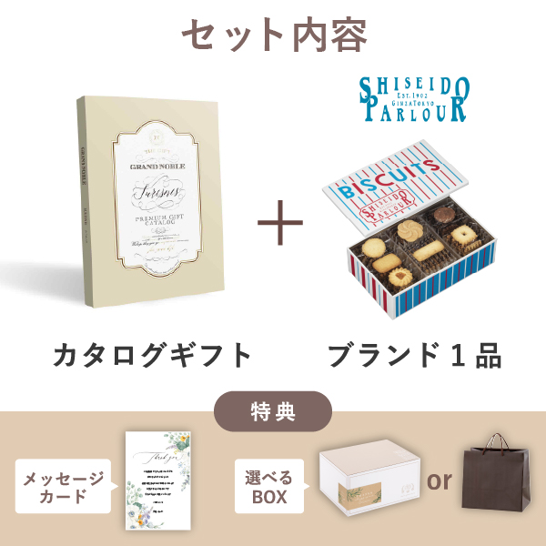カタログギフトに人気の「資生堂パーラー ビスキュイ 30枚入」をプラスした、ボリューム満点♪プレミアムな内祝いのギフトセットです。