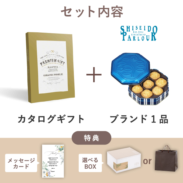ブランド内祝いギフトセット(カタログギフト グランノーブル【4300円コース】バスティア+資生堂パーラー 花椿ビスケット 24枚入)|内祝い・お返しギフトならPIARY(ピアリー)