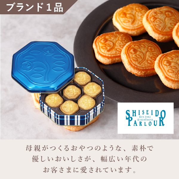 ブランドギフトは人気ブランド、資生堂パーラーを代表する花椿ビスケットの詰め合せです。洋菓子の原形ともいえるシンプルなレシピは、まるで母親がつくるおやつのような素朴な味わい。
