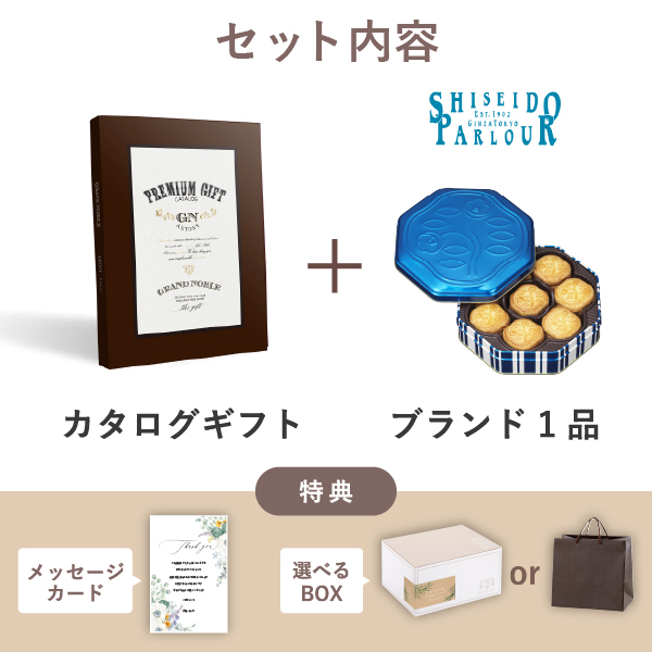 カタログギフトに人気の「資生堂パーラー 花椿ビスケット 24枚入」をプラスした、ボリューム満点♪プレミアムな内祝いのギフトセットです。