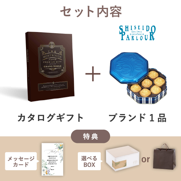 ブランド内祝いギフトセット(カタログギフト グランノーブル【50800円コース】モンルージュ+資生堂パーラー 花椿ビスケット 24枚入)|内祝い・お返しギフトならPIARY(ピアリー)