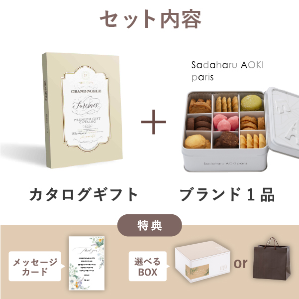 カタログギフトに人気の「サダハル アオキ パリ コフレ アソーティモン ドゥ ビスキュイ ドゥミ」をプラスした、見た目もおしゃれでプレミアムな内祝いのギフトセットです。
