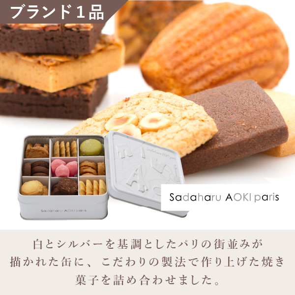 フランスショコラ愛好家団体「クラブ・デ・クロクール・ドゥ・ショコラ」によるショコラ品評会にて、5年連続で最高位となる「LES INCONTOURNABLE」を受賞したサダハル アオキ パリが贈るスイーツ。 パリの街並みが描かれた白とシルバーを基調とした缶に、こだわりの製法で作り上げた9種類の焼き菓子を詰め合わせました。 フランス産発酵バターやフランス産の小麦など、こだわりの素材を使用しアトリエで丁寧に焼き上げています。 豊潤なレーズンと優雅な香りのシナモンを合わせた「レザン」、アールグレイの香りが上品に広がるサブレ「アールグレイ」、口に含むとふわっと溶けるイチゴメレンゲ「ムラング フレーズ」など、9種類の味がお楽しみいただけます。 手に届いた時、「可愛い!」と感じていただける缶入りクッキーは、贈りものにおすすめです。