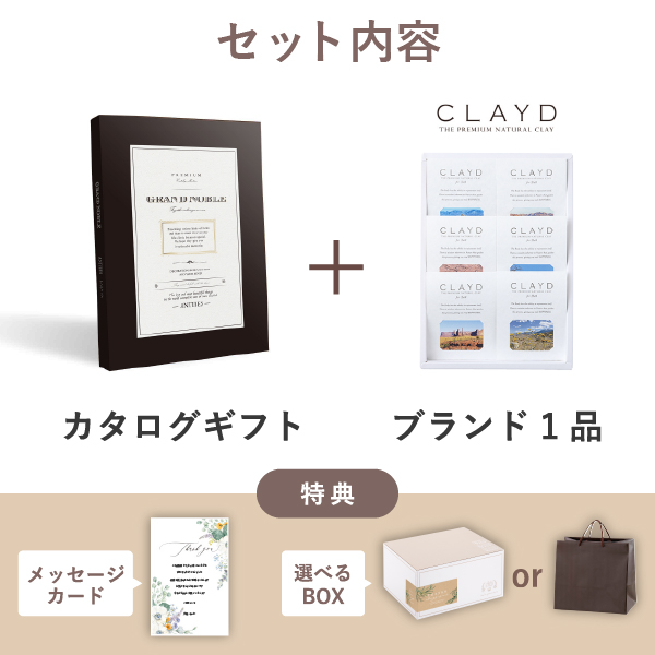 カタログギフトに人気の「CLAYD(クレイド) ワンタイムギフト」をプラスした、ボリューム満点♪プレミアムなセットです。