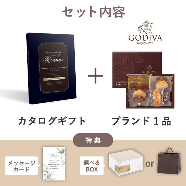 ブランド内祝いギフトセット(カタログギフト グランノーブル【3800円コース】ロアンヌ+GODIVA パティスリーアソートメント8個入)|内祝い・お返しギフトならPIARY(ピアリー)