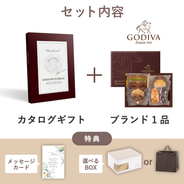ブランド内祝いギフトセット(カタログギフト グランノーブル【5800円コース】モントルイユ+GODIVA パティスリーアソートメント8個入)|内祝い・お返しギフトならPIARY(ピアリー)