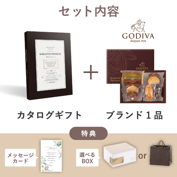 ブランド内祝いギフトセット(カタログギフト グランノーブル【20800円コース】アンティーブ+GODIVA パティスリーアソートメント8個入)|内祝い・お返しギフトならPIARY(ピアリー)