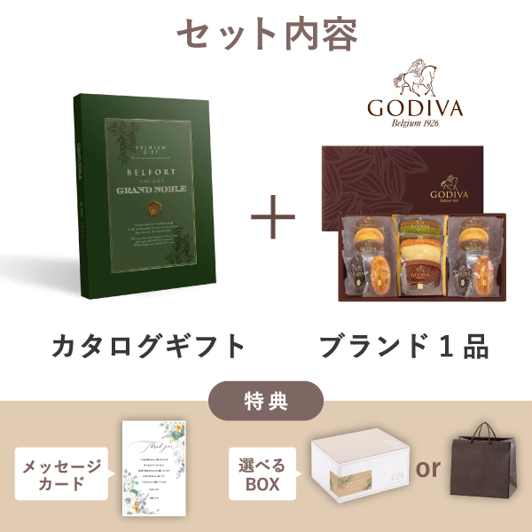 ブランド内祝いギフトセット(カタログギフト グランノーブル【8800円コース】ベルフォール+GODIVA パティスリーアソートメント13個入)|内祝い・お返しギフトならPIARY(ピアリー)