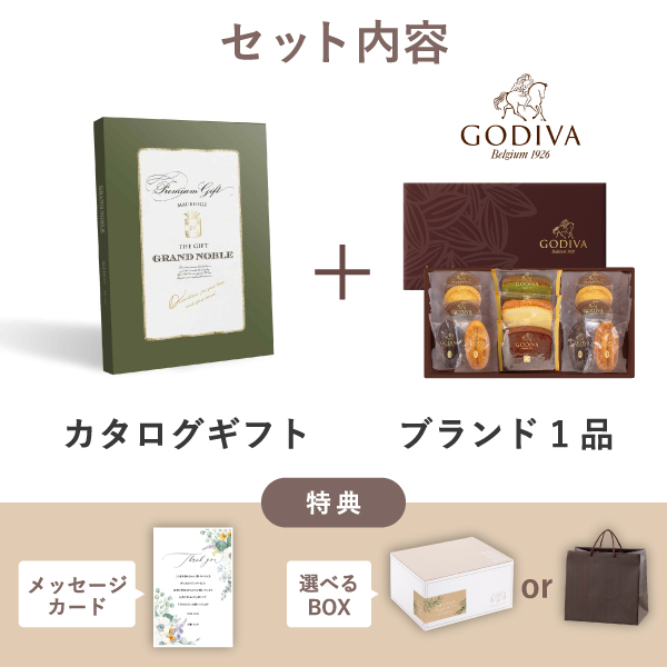 カタログギフトに人気の「ゴディバ(GODIVA)」をプラスした、ボリューム満点♪内祝いのギフトセットです。