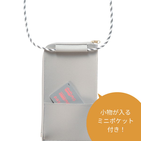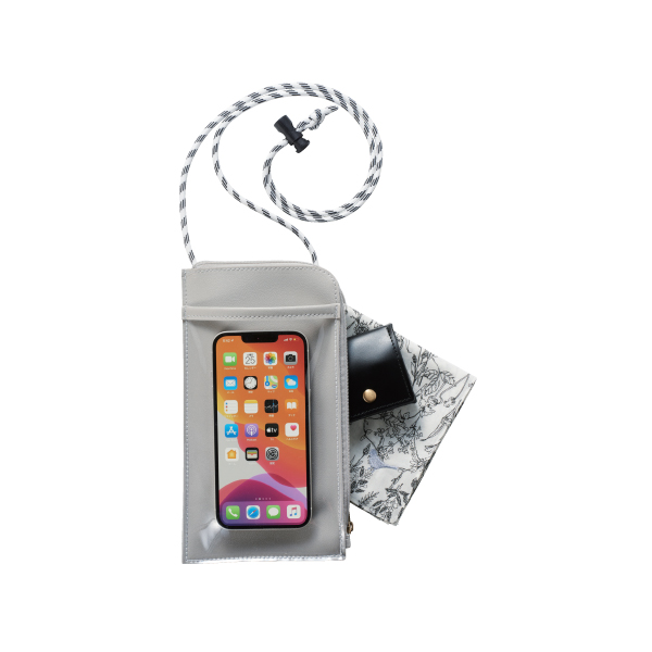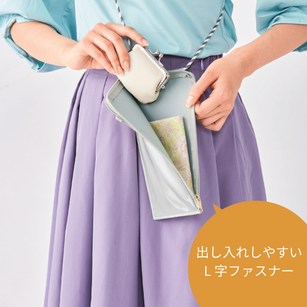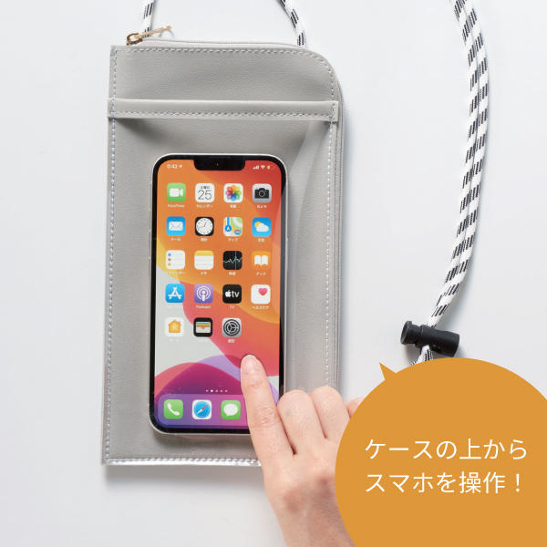 身軽にお出かけするのに便利なスマホポーチ。スマホを入れてそのまま使えるクリアポケット。出しやすく収納しやすいL字型のファスナー仕様です。