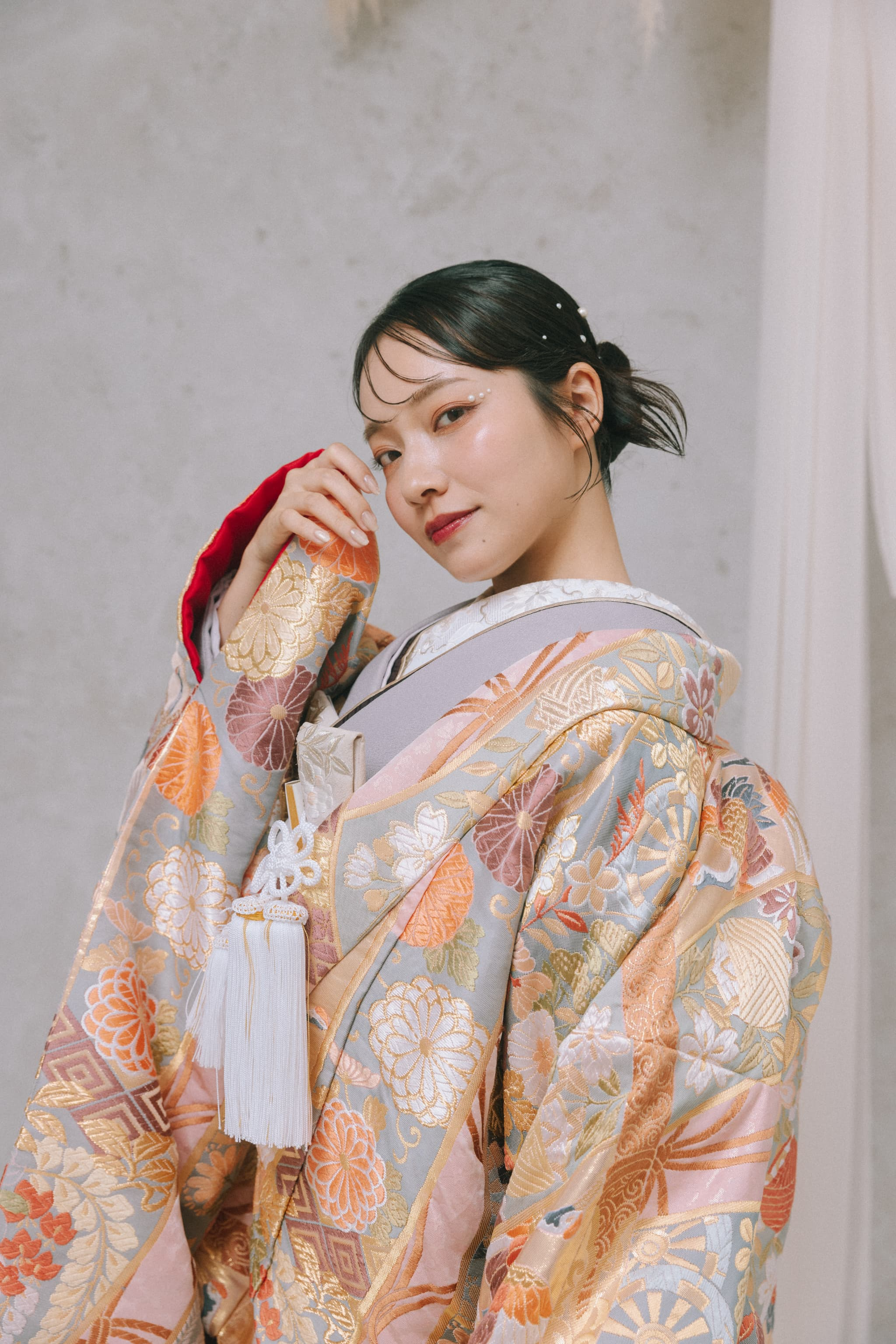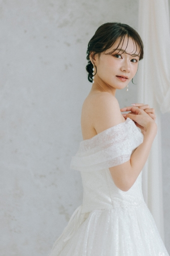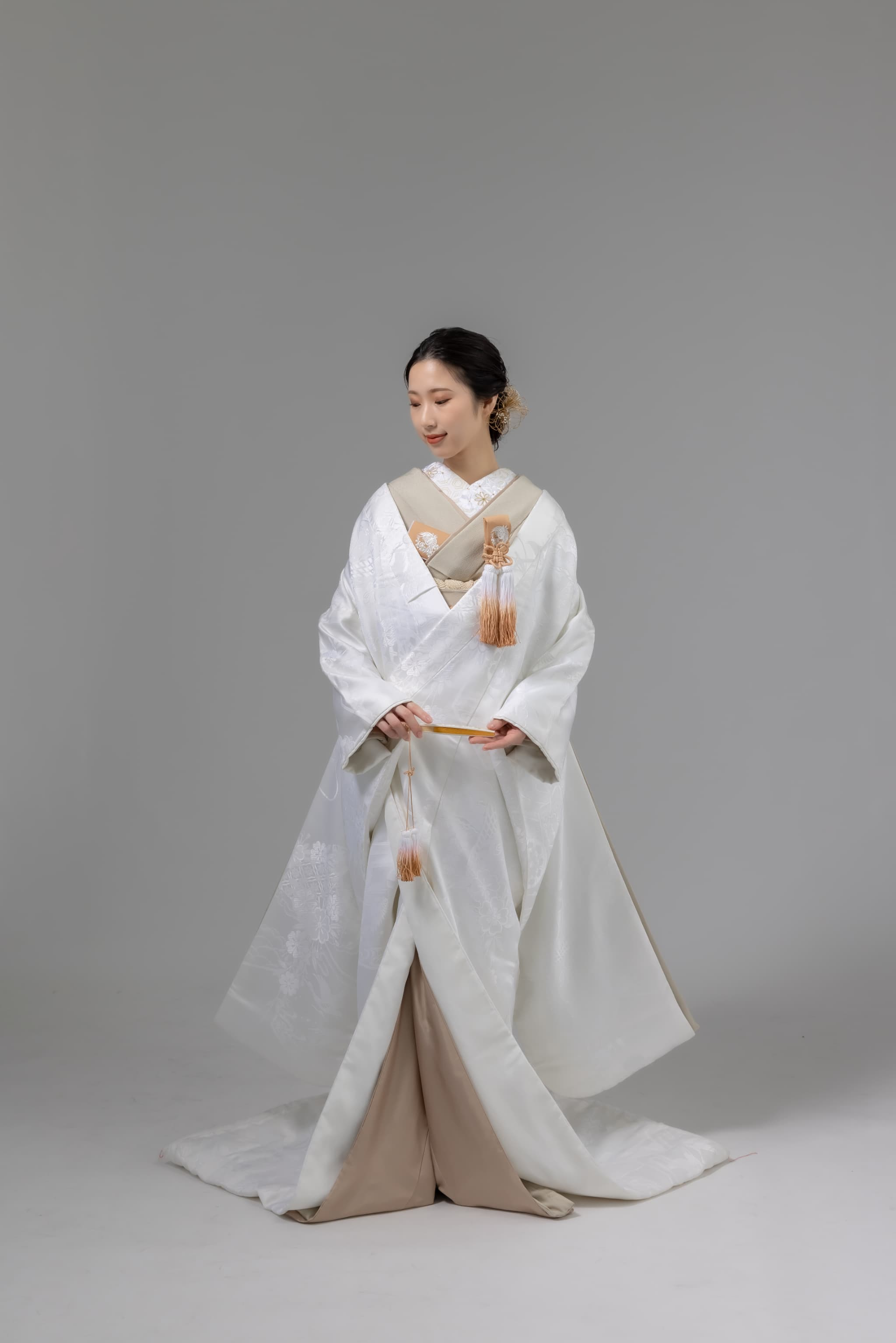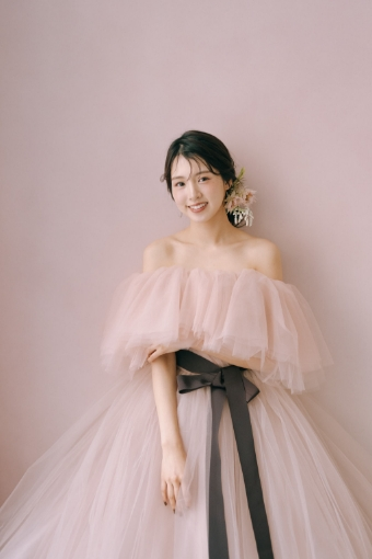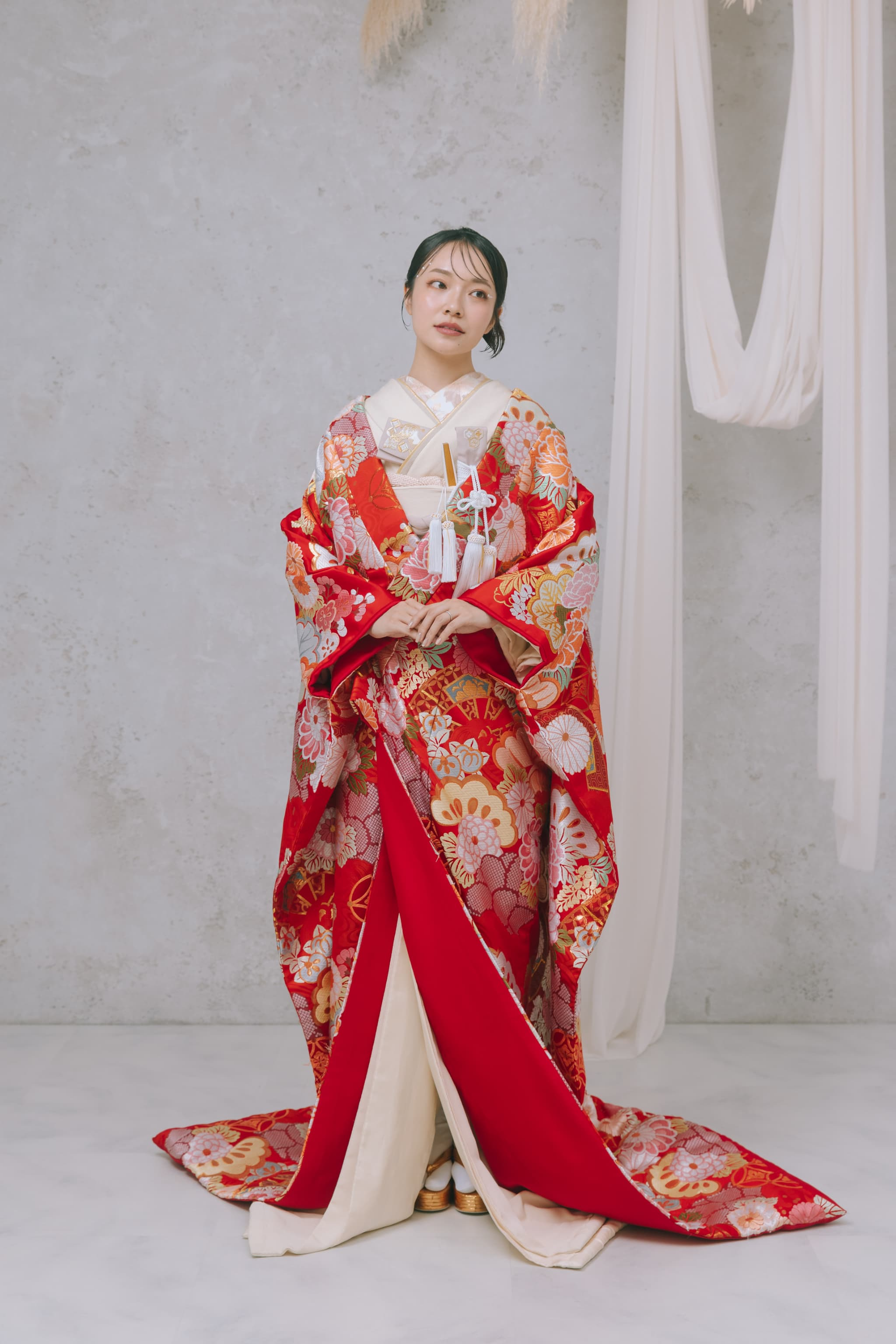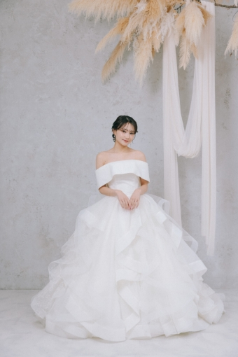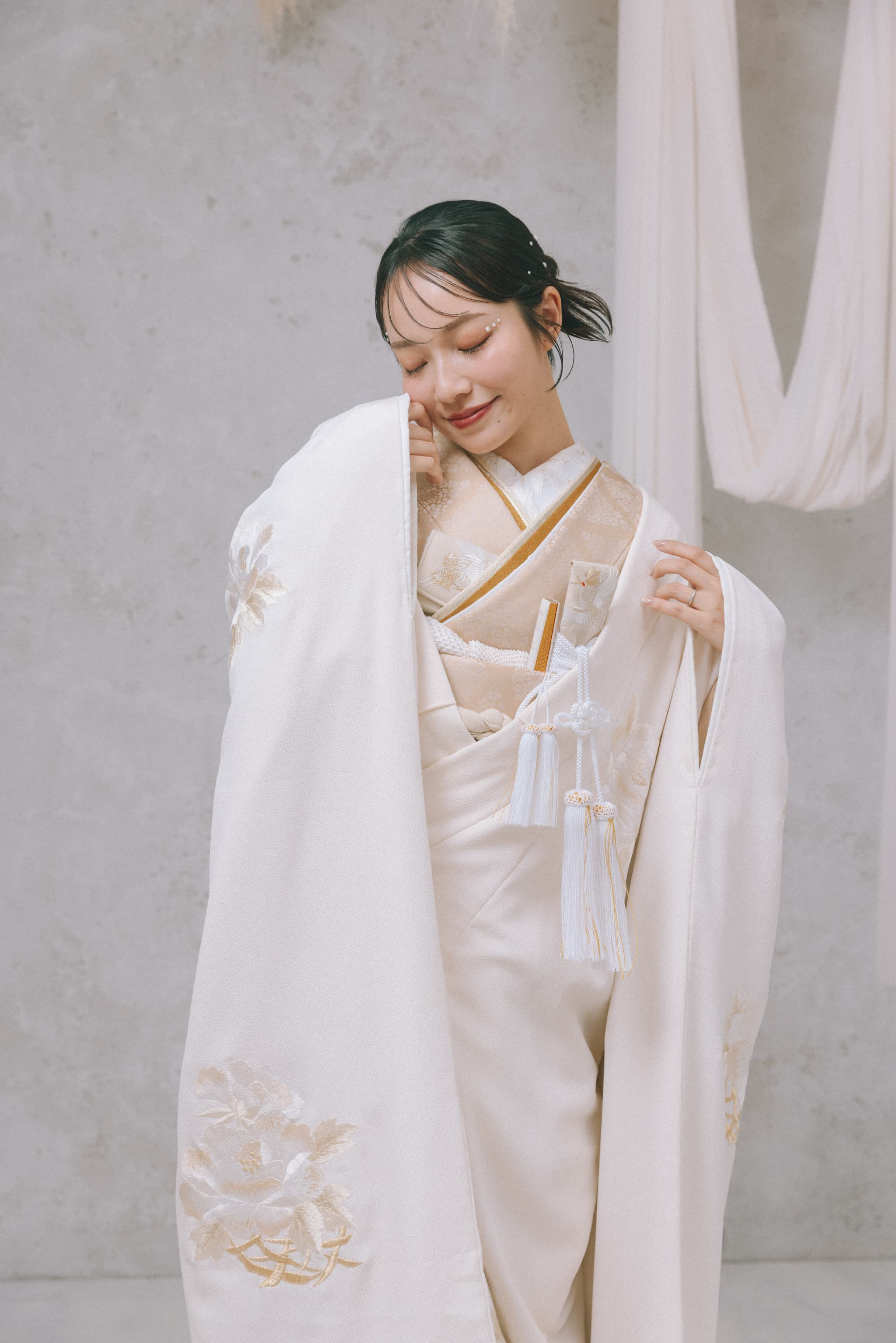 花嫁の象徴とされるウェディングドレスや和装の打掛。肌の色や体型、また、なりたいイメージに合わせて衣装選びをサポートします。