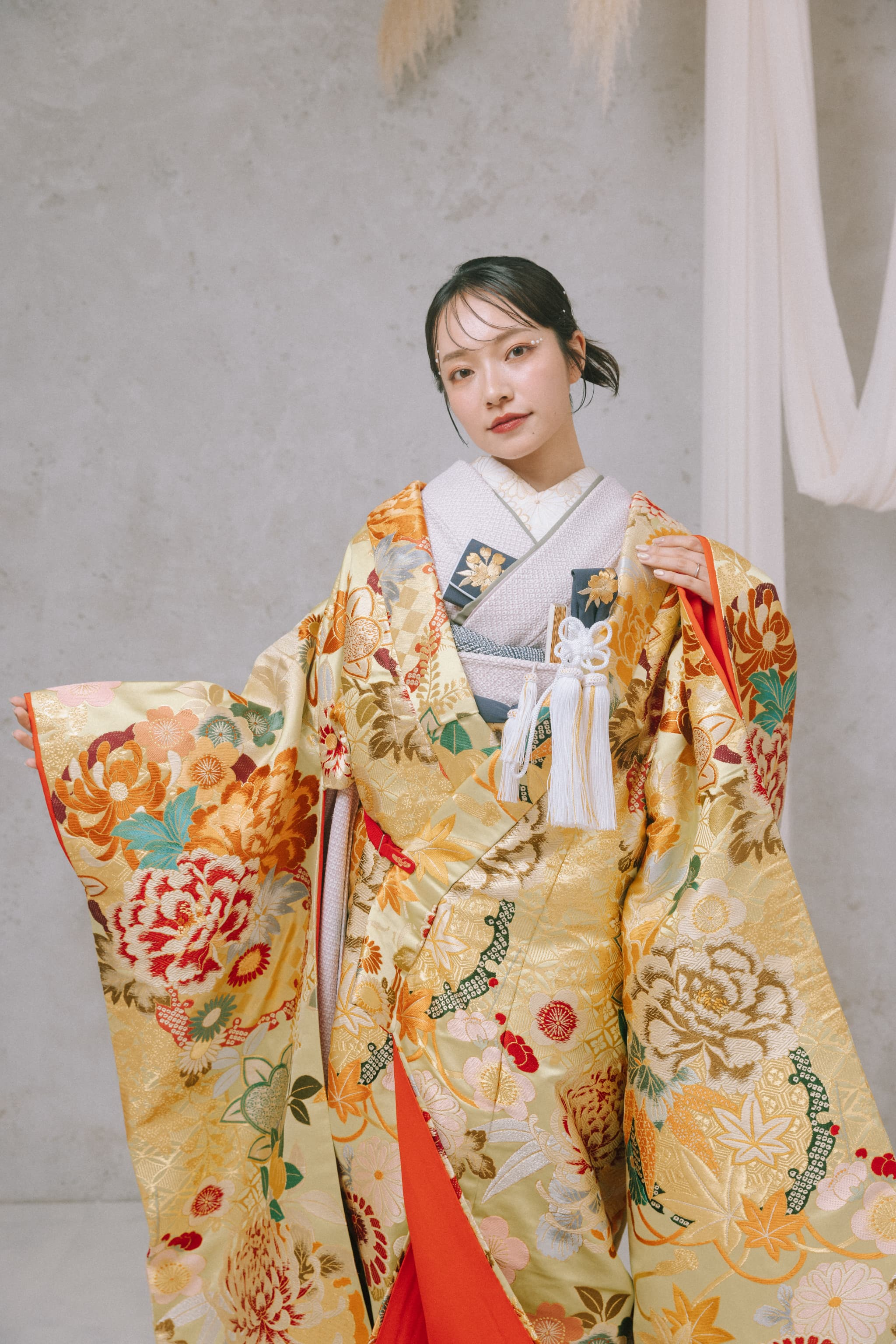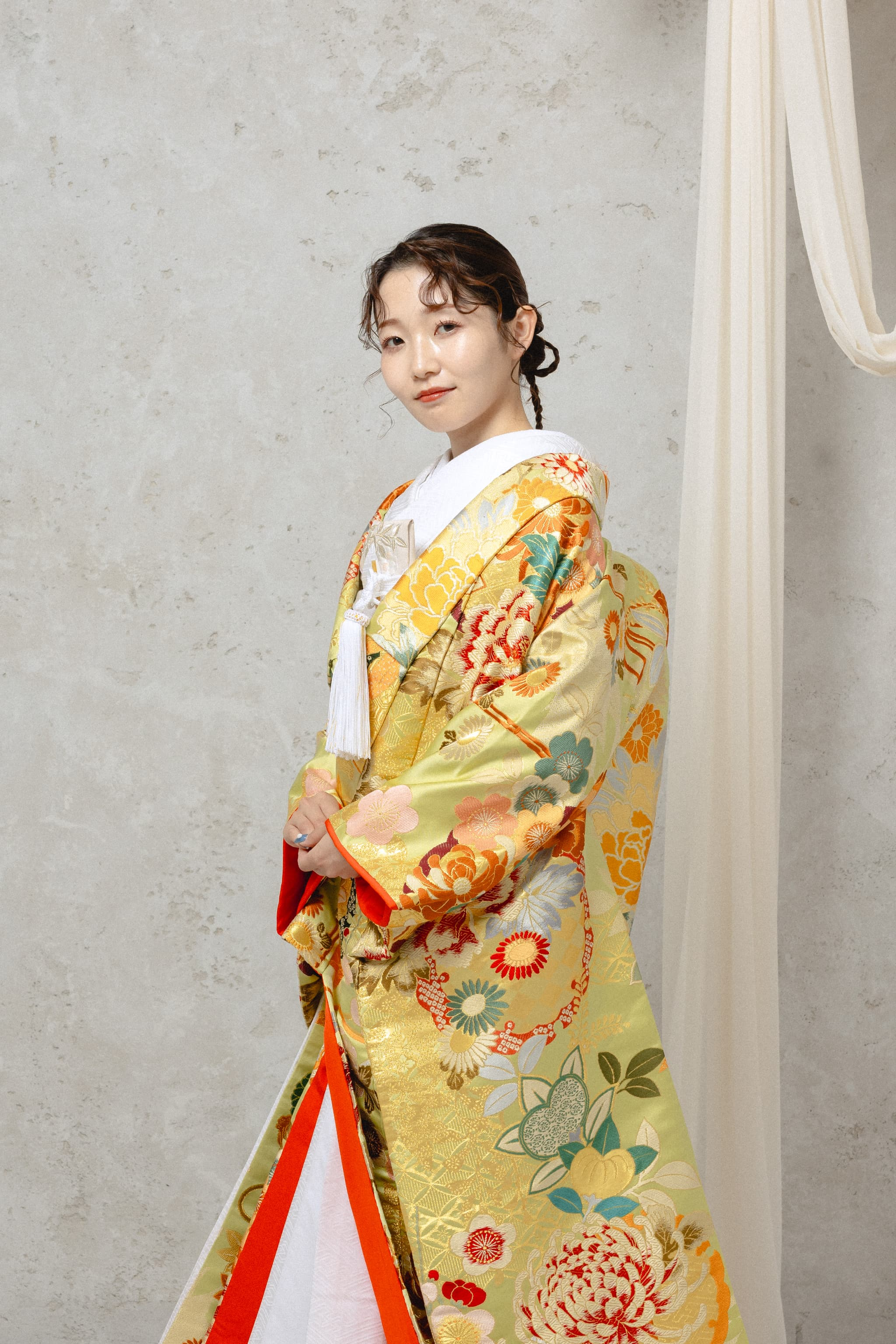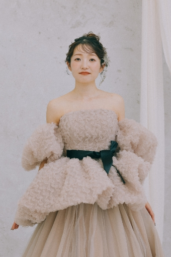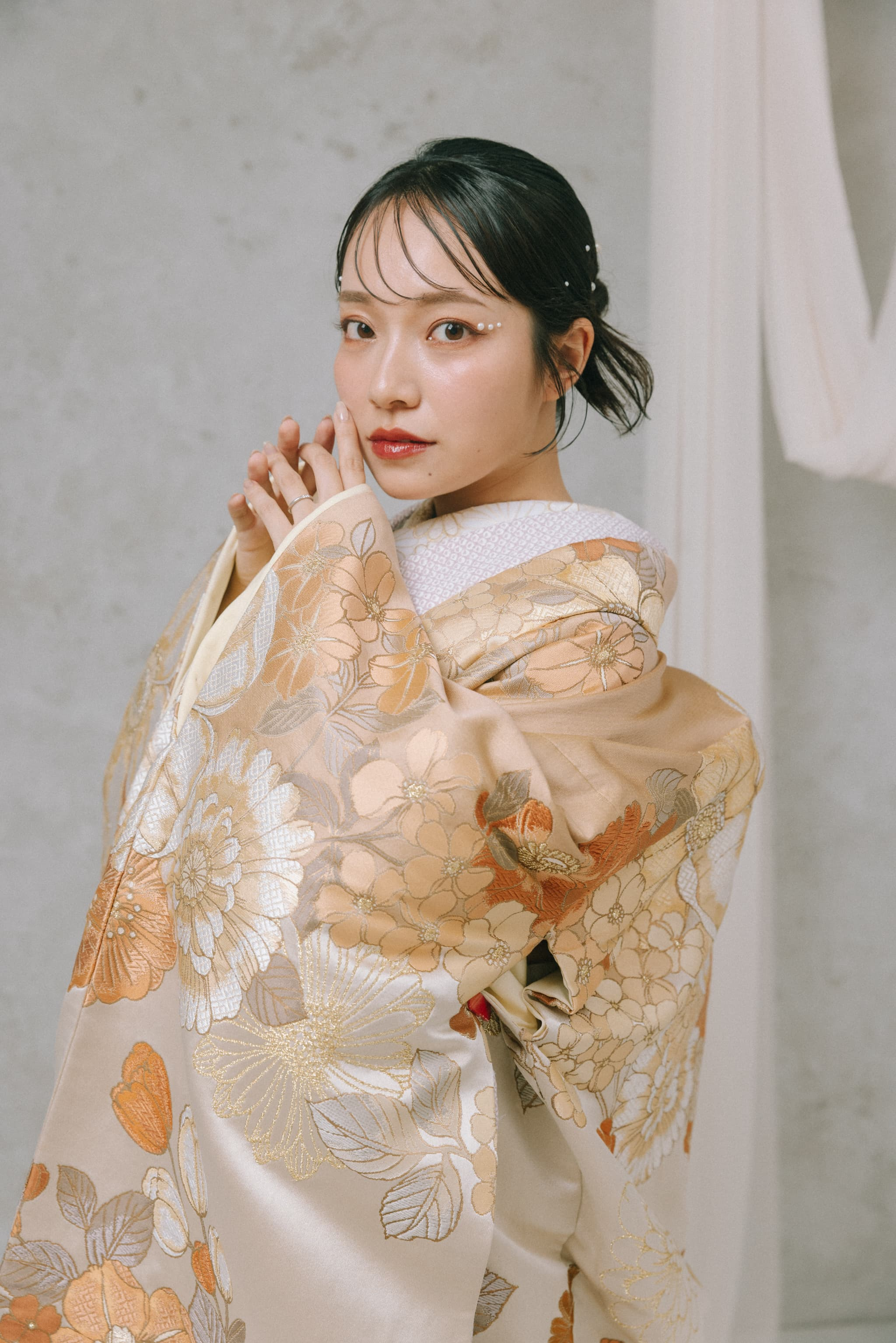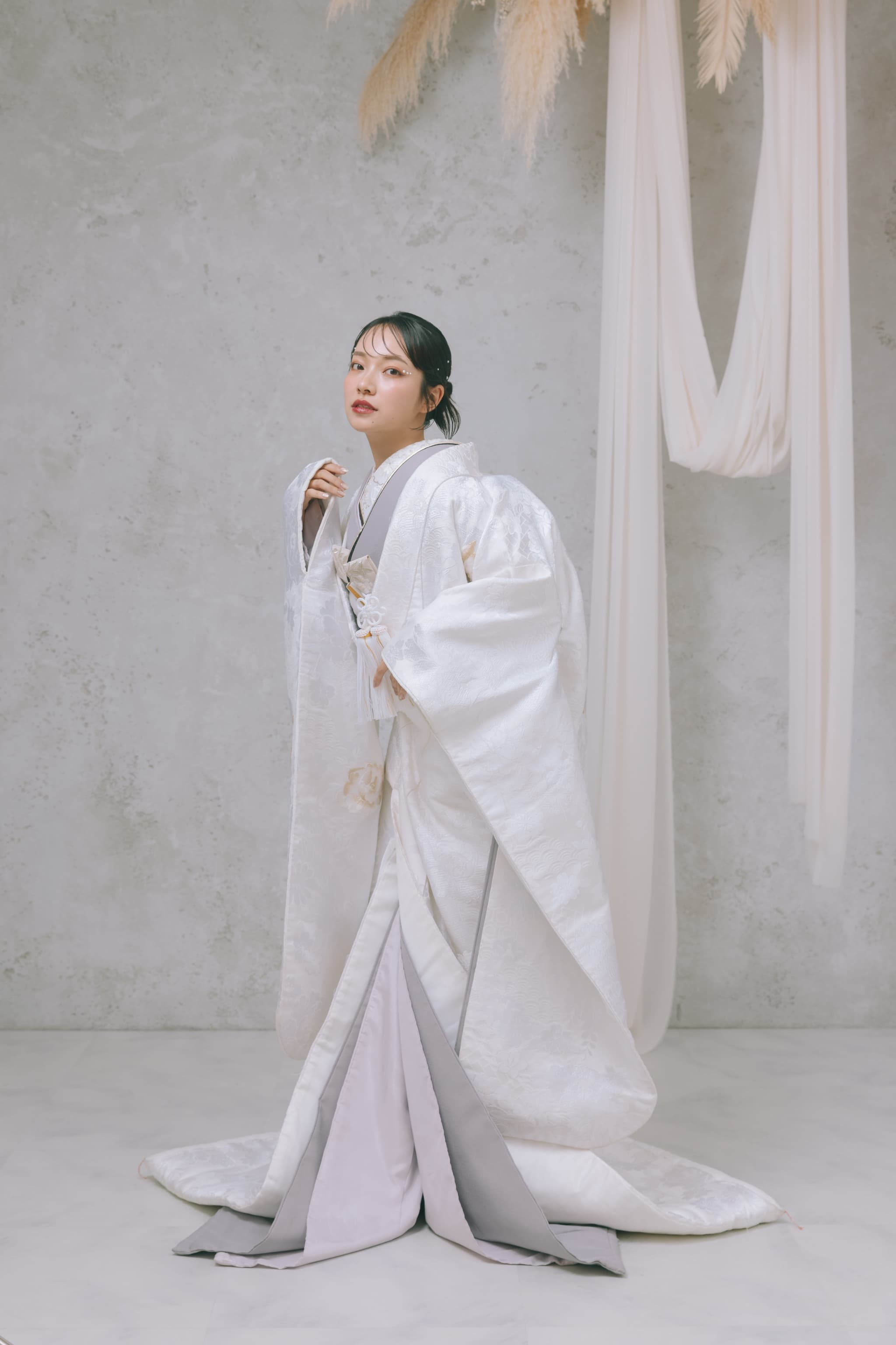 花嫁の象徴とされるウェディングドレスや和装の打掛。肌の色や体型、また、なりたいイメージに合わせて衣装選びをサポートします。